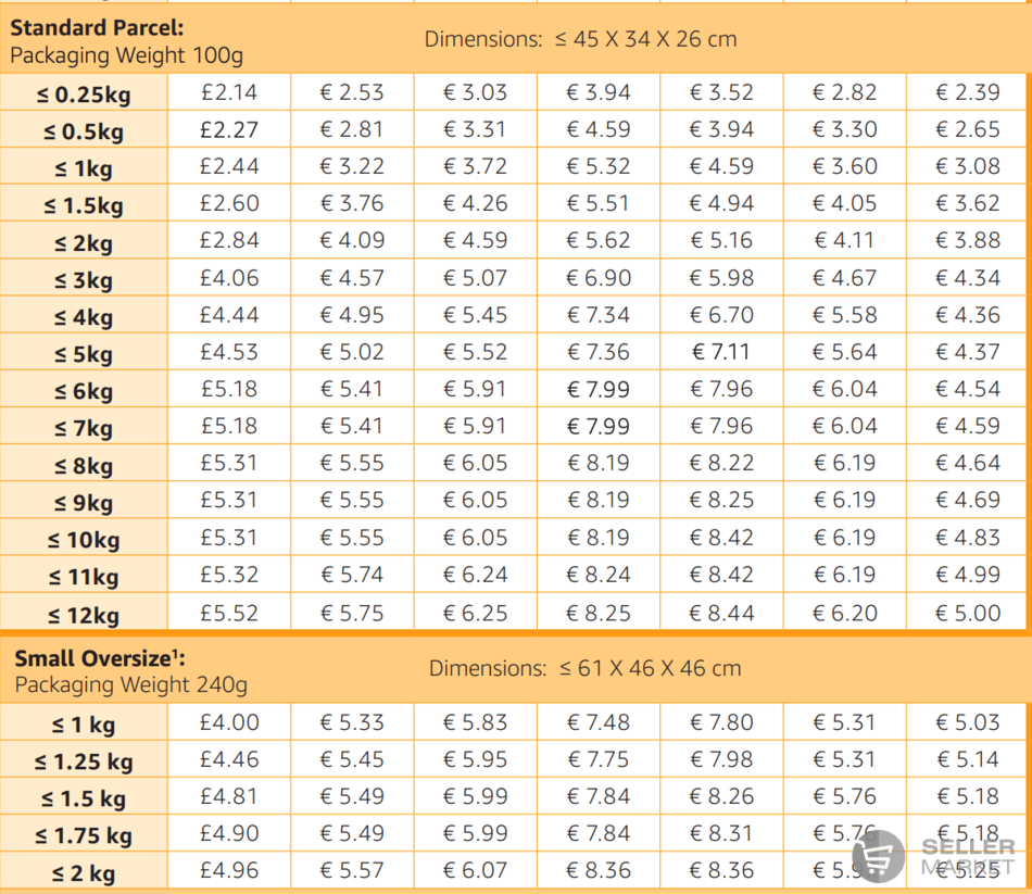 Стоимость хранения на складе зависит от вида товара и времени хранения. Указана ежемесячная цена в фунтах стерлингов за кубический фут. Дешевле всего хранить товары на складах Великобритании. Стоимость хранения товаров возрастает на £4.3, если они хранятся более 365 дней.